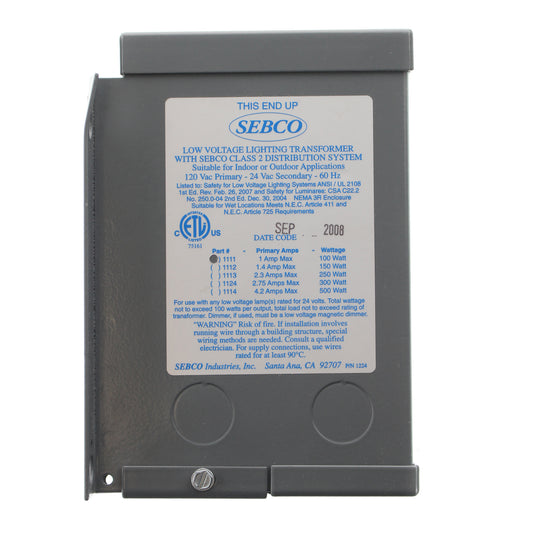 SEBCO INDUSTRIES 1111 LOW VOLTAGE LIGHTING TRANSFORMER, 120V:IN, 24VAC OUT, 100W