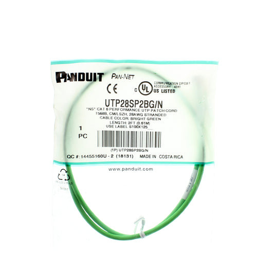 PANDUIT UTP28SP2BG/N CAT6 CABLE UTP PATCH CORD, 2-FEET, BRIGHT GREEN (5 PACK)