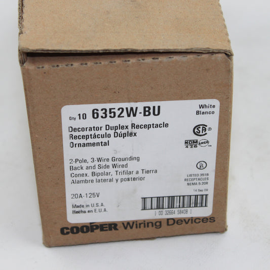 COOPER 6352W-BU DECORATOR DECORA DUPLEX RECEPTACLE 20A 125V; WHITE (10 PACK)